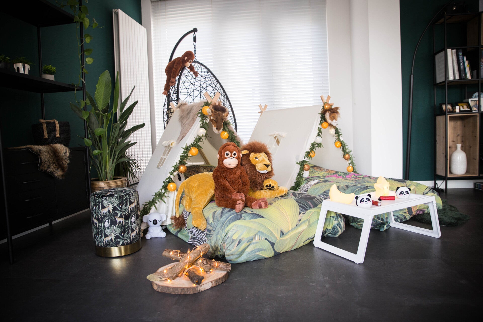 Ook hebben we een sterrenhemel lamp, met verschillende kleurenfuncties te huur. ´s Avonds als ze onder hun mooie dekbed liggen kan er gezellig gekletst worden onder de prachtige sterren. Je kan zelfs je muziek via Bluetooth doorsturen naar de speaker, dat is nou echt lekker in slaap vallen. Of je maakt het lekker spannend met jungle geluiden als je het themapakket jungle hebt gekozen, dan lijkt het net echt.