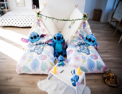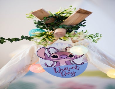 Dit thema bestaat uit maximaal 6 tentjes met leuke Stitch dekbedovertreksets en schattige Stitch kussentjes, ananas nachtlampjes, zaklampjes, kokosnoot drinkbekers, houten hangers met Angel erop voor aan de tent, kleurrijke lichtjes slinger en lichtslinger met blaadjes en een Hawaii bloemenkrans hoort er ook bij zoals een ketting,armbandjes en hoofd bloemenkrans en natuurlijk schattige Stitch knuffeltjes en 1 grote Stitch van 60 cm hoog. En per 2 tentjes een tray met imitatie bontkleed.