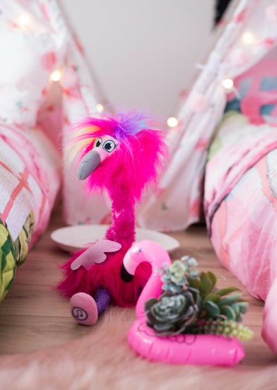 Dit thema huur je met een geweldig flamingo dekbedovertrek set, lichtjes slinger met schattige wolkjes, pom pom lichtjes slinger, een bloemen blaadjes slinger, een staande mini flamingo, een tray, een bontkleed, lantaarns en een roze kauwgomballenmachine! En knalroze flamingo glazen(plastic) en opblaasbare flamingo's met plantjes erin, kortom super gezellig! Plus er zit ook een nep kampvuurtje bij dus zet de marshmallows maar klaar, jullie mini vakantie kan beginnen! En super gezellig nieuws! Flossi de flamingo komt graag mee logeren, deze flamingo is niet zomaar een flamingo maar eentje die je na kan praten als je op haar rechter pootje drukt en druk je op haar linker pootje dan komen er swingende liedjes en danst ze met haar hele haar nek mee.