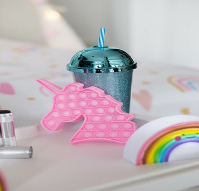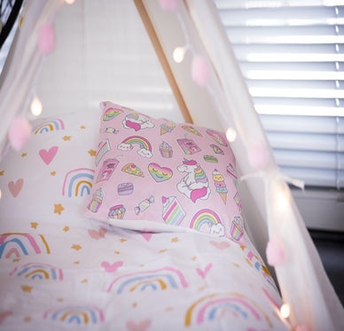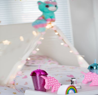 Dit thema heeft maximaal 6 tentjes en komt met een regenboog dekbedovertrek en regenboog nachtlampjes, eenhoorn kussentjes en knuffeltjes, nep bontkleedjes, trays, eenhoorn popits , leuke glitter bekers en zaklampjes!
